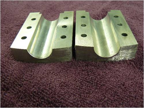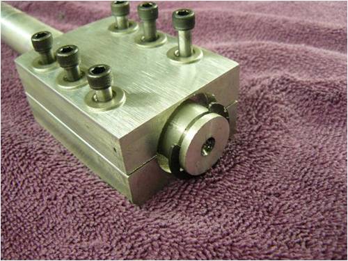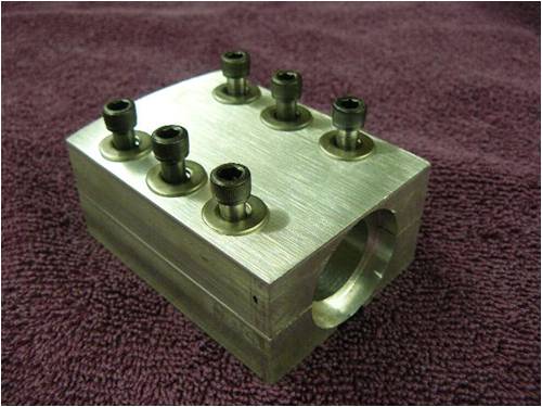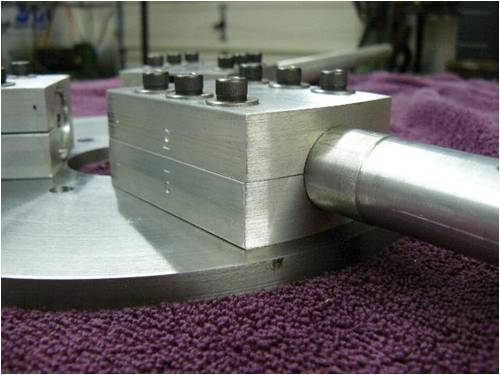 I used 6061-T6 extruded alum rectangle stock to machine three mounting blocks to mount the alum rods to the steel hub plate. Using six ¼ 28 socket head cap screws per mounting block to secure both the blocks and rods to the hub plate gave me plenty of pressure to keep things nice and tight. Maintaining a gap of approximately 20 thousands of an inch between the upper and lower extrude-ions applies a spring pressure (if you will) on the rods to eliminate the cap screws loosening from vibration.