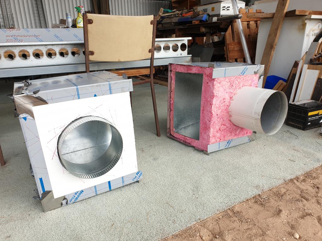 This is the cold duct 90 degree input. I had found the short 250mm spigot and plate in the local scrap yard for $10 and I fabricated the rest.