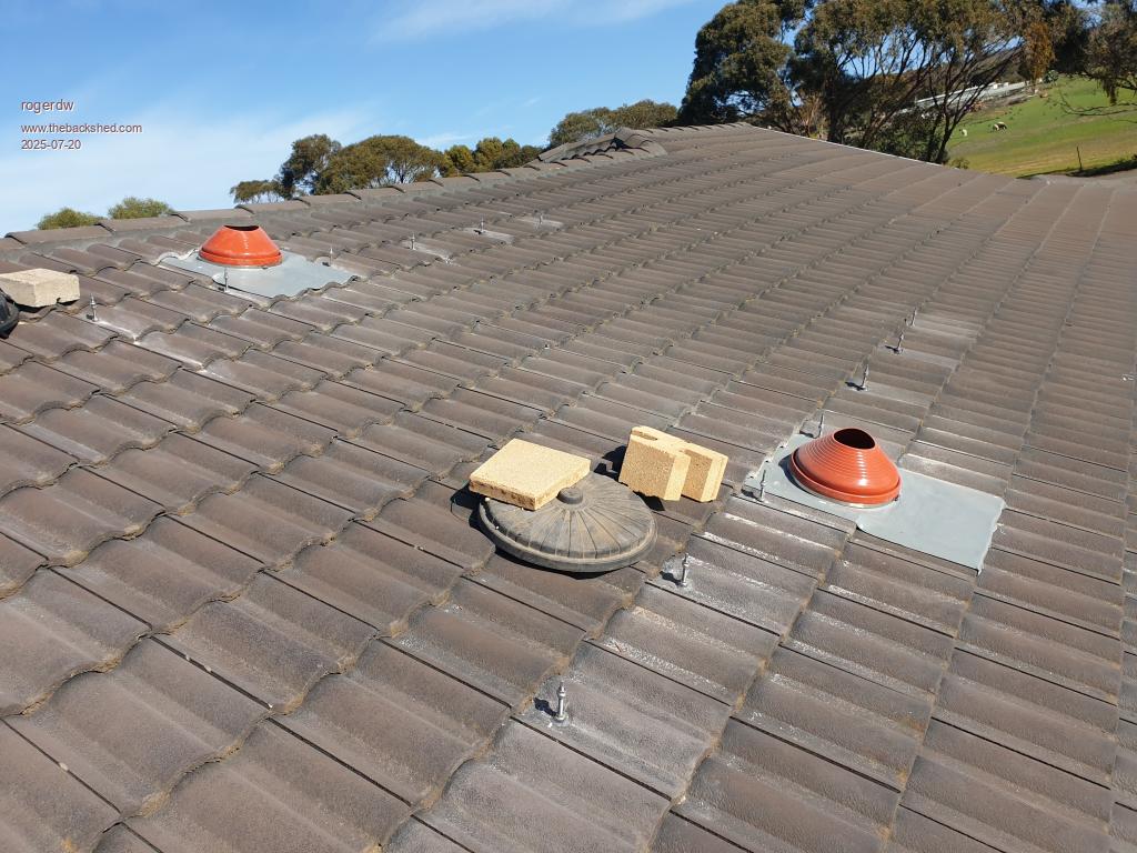Once I decided to spend the money to buy the flashings it certainly got easier  ...  and they fitted well  ...  a lot better than I expected really. The top one was close to the ridgecap and I didn't want to loosen the mortar  ...  so I tapped in a couple wedges, just enough to create a 2 or 3mm gap  ...  then I preshaped the "lead" sheeting on the lower tiles  ...  and it slid in perfectly.