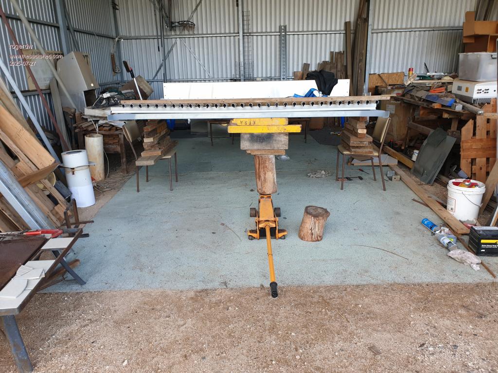 Haha, that could be tricky and dangerous too I imagine. I had enough trouble this morning with the trolley jack sagging as I was trying to level the frame out. I had to support the frame from the ends so my timber would fit across underneath to transcribe these holes  ...  so the frame was drooping in the middle pretty badly. Would have been easier with some help  ...  but it's less drama by myself. I had my young fellow up on the roof yesterday holding the tape measure but he isn't fond of heights and I didn't fancy dragging him out again to help.