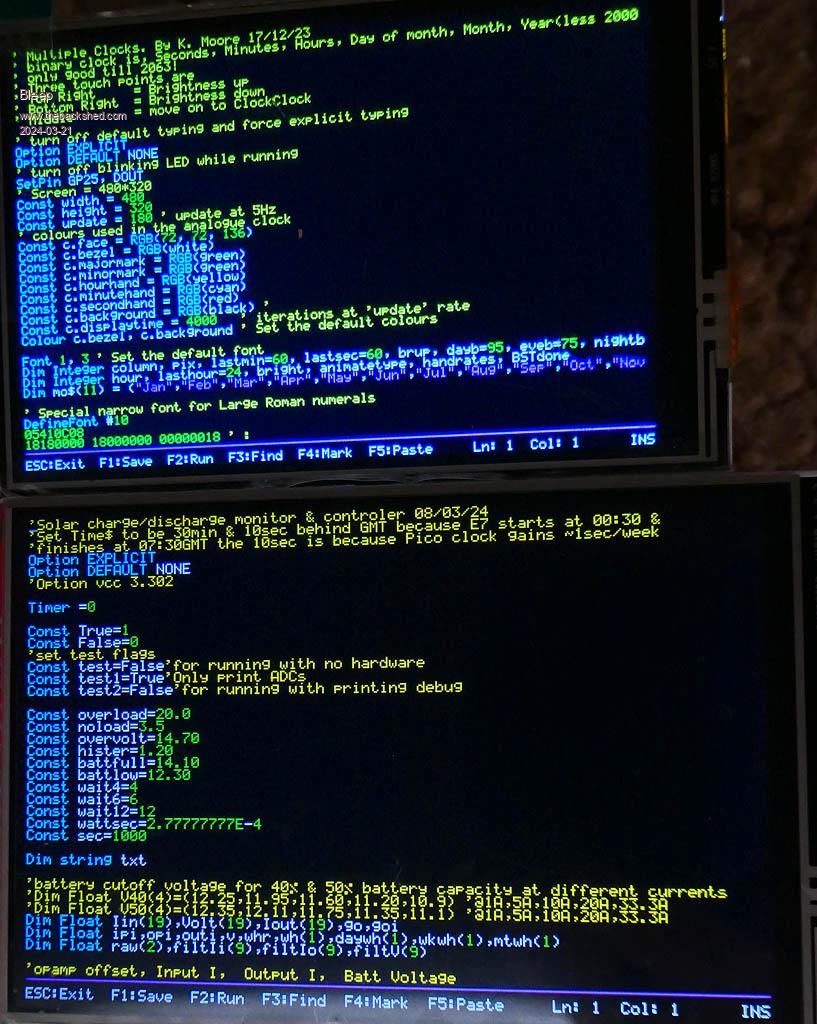 Hi Peter, Further testing this morning, the double page scroll while listing a file only happens when you use the USB keyboards, it's as though there is key bounce, in fact, if I have both a USB keyboard and a terminal connected together and I start the listing from the terminal, works great every time, but if I then start to use the USB keyboard to "Press any key" I get 2 screens worth, go back to terminal all good, all in the same listing of a file. I have also now tested using 2 different USB keyboards, one wireless and one wired. Options, I think my touch is broken on the screen. PicoMite MMBasic USB Edition 5.09.00b7 OPTION SERIAL CONSOLE COM2,GP8,GP9 OPTION SYSTEM SPI GP18,GP19,GP16 OPTION AUTORUN 1 OPTION COLOURCODE ON OPTION KEYBOARD UK, 0, 0, 200, 100 OPTION PICO OFF OPTION CPUSPEED 252000 'KHz OPTION LCDPANEL CONSOLE ,,,,,NOSCROLL OPTION DISPLAY 26, 60 OPTION LCDPANEL ILI9481, LANDSCAPE,GP15,GP14,GP13 OPTION TOUCH GP12,GP11 GUI CALIBRATE 0, 3948, 4090, -1300, 9223372036854775807 OPTION SDCARD GP22 OPTION KEYBOARD REPEAT 200,100 Code being listed. 2multiclock480x320.BAS.zip You said a while back, that a LCD that is 480x320 would not be able to have both a Frame buffer and a Layer buffer, because of memory limitations. Is there a way of effectively forcing a smaller Frame/Layer buffer, along with only updating a smaller portion of the LCD, to simulate using say a 240x320 screen? for debugging and testing purposes on a larger screen, so while at command prompt/editing full size, then the program can request a smaller screen/buffer? I realise this could be almost impossible? Regards, Kevin. Edited 2024-03-20 20:41 by Bleep |