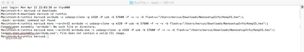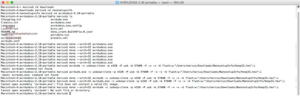 OK, had a though about what you were saying that averdude must run on the mac (without mono) for the IDE to function, so looked for the command line in the previously posted IDE attempt to use the USBasp:- /Users/marcus/Downloads/Arduino.app/Contents/Java/hardware/tools/avr/bin/avrdude -C/Users/marcus/Downloads/Arduino.app/Contents/Java/hardware/tools/avr/etc/avrdude.conf -v -p atmega328p -c usbasp -P usb -U flash:w:/var/folders/2s/n4lnvcqs55g0zlsbjg2tlsl80000gp/T/arduino_build_174515/Blink.ino.hex:i so what happens if i graft in the path to the .hex file we want:- /Users/marcus/Downloads/Arduino.app/Contents/Java/hardware/tools/avr/bin/avrdude -C/Users/marcus/Downloads/Arduino.app/Contents/Java/hardware/tools/avr/etc/avrdude.conf -v -p atmega328p -c usbasp -P usb -U flash:w:/Users/marcus/Downloads/NanosetupInfo/KeepIS.hex:i paste that into Terminal and:- Macintosh-4:~ marcus$ /Users/marcus/Downloads/Arduino.app/Contents/Java/hardware/tools/avr/bin/avrdude -C/Users/marcus/Downloads/Arduino.app/Contents/Java/hardware/tools/avr/etc/avrdude.conf -v -p atmega328p -c usbasp -P usb -U flash:w:/Users/marcus/Downloads/NanosetupInfo/KeepIS.hex:i avrdude: Version 6.3-20190619 Copyright (c) 2000-2005 Brian Dean, http://www.bdmicro.com/ Copyright (c) 2007-2014 Joerg Wunsch System wide configuration file is "/Users/marcus/Downloads/Arduino.app/Contents/Java/hardware/tools/avr/etc/avrdude.conf" User configuration file is "/Users/marcus/.avrduderc" User configuration file does not exist or is not a regular file, skipping Using Port : usb Using Programmer : usbasp AVR Part : ATmega328P Chip Erase delay : 9000 us PAGEL : PD7 BS2 : PC2 RESET disposition : dedicated RETRY pulse : SCK serial program mode : yes parallel program mode : yes Timeout : 200 StabDelay : 100 CmdexeDelay : 25 SyncLoops : 32 ByteDelay : 0 PollIndex : 3 PollValue : 0x53 Memory Detail : Block Poll Page Polled Memory Type Mode Delay Size Indx Paged Size Size #Pages MinW MaxW ReadBack ----------- ---- ----- ----- ---- ------ ------ ---- ------ ----- ----- --------- eeprom 65 20 4 0 no 1024 4 0 3600 3600 0xff 0xff flash 65 6 128 0 yes 32768 128 256 4500 4500 0xff 0xff lfuse 0 0 0 0 no 1 0 0 4500 4500 0x00 0x00 hfuse 0 0 0 0 no 1 0 0 4500 4500 0x00 0x00 efuse 0 0 0 0 no 1 0 0 4500 4500 0x00 0x00 lock 0 0 0 0 no 1 0 0 4500 4500 0x00 0x00 calibration 0 0 0 0 no 1 0 0 0 0 0x00 0x00 signature 0 0 0 0 no 3 0 0 0 0 0x00 0x00 Programmer Type : usbasp Description : USBasp, http://www.fischl.de/usbasp/ avrdude: auto set sck period (because given equals null) avrdude: AVR device initialized and ready to accept instructions Reading | ################################################## | 100% 0.01s avrdude: Device signature = 0x1e9516 (probably m328pb) avrdude: Expected signature for ATmega328P is 1E 95 0F Double check chip, or use -F to override this check. avrdude done. Thank you. Macintosh-4:~ marcus$ Wellthat's definitly promising,but it's still detecting that the nanois a 328pb - so try: /Users/marcus/Downloads/Arduino.app/Contents/Java/hardware/tools/avr/bin/avrdude -C/Users/marcus/Downloads/Arduino.app/Contents/Java/hardware/tools/avr/etc/avrdude.conf -v -p m328pb -c usbasp -P usb -U flash:w:/Users/marcus/Downloads/NanosetupInfo/KeepIS.hex:i Macintosh-4:~ marcus$ /Users/marcus/Downloads/Arduino.app/Contents/Java/hardware/tools/avr/bin/avrdude -C/Users/marcus/Downloads/Arduino.app/Contents/Java/hardware/tools/avr/etc/avrdude.conf -v -p m328pb -c usbasp -P usb -U flash:w:/Users/marcus/Downloads/NanosetupInfo/KeepIS.hex:i avrdude: Version 6.3-20190619 Copyright (c) 2000-2005 Brian Dean, http://www.bdmicro.com/ Copyright (c) 2007-2014 Joerg Wunsch System wide configuration file is "/Users/marcus/Downloads/Arduino.app/Contents/Java/hardware/tools/avr/etc/avrdude.conf" User configuration file is "/Users/marcus/.avrduderc" User configuration file does not exist or is not a regular file, skipping Using Port : usb Using Programmer : usbasp AVR Part : ATmega328PB Chip Erase delay : 9000 us PAGEL : PD7 BS2 : PC2 RESET disposition : dedicated RETRY pulse : SCK serial program mode : yes parallel program mode : yes Timeout : 200 StabDelay : 100 CmdexeDelay : 25 SyncLoops : 32 ByteDelay : 0 PollIndex : 3 PollValue : 0x53 Memory Detail : Block Poll Page Polled Memory Type Mode Delay Size Indx Paged Size Size #Pages MinW MaxW ReadBack ----------- ---- ----- ----- ---- ------ ------ ---- ------ ----- ----- --------- eeprom 65 20 4 0 no 1024 4 0 3600 3600 0xff 0xff flash 65 6 128 0 yes 32768 128 256 4500 4500 0xff 0xff lfuse 0 0 0 0 no 1 0 0 4500 4500 0x00 0x00 hfuse 0 0 0 0 no 1 0 0 4500 4500 0x00 0x00 efuse 0 0 0 0 no 1 0 0 4500 4500 0x00 0x00 lock 0 0 0 0 no 1 0 0 4500 4500 0x00 0x00 calibration 0 0 0 0 no 1 0 0 0 0 0x00 0x00 signature 0 0 0 0 no 3 0 0 0 0 0x00 0x00 Programmer Type : usbasp Description : USBasp, http://www.fischl.de/usbasp/ avrdude: auto set sck period (because given equals null) avrdude: AVR device initialized and ready to accept instructions Reading | ################################################## | 100% 0.01s avrdude: Device signature = 0x1e9516 (probably m328pb) avrdude: safemode: lfuse reads as FF avrdude: safemode: hfuse reads as DA avrdude: safemode: efuse reads as FD avrdude: NOTE: "flash" memory has been specified, an erase cycle will be performed To disable this feature, specify the -D option. avrdude: erasing chip avrdude: auto set sck period (because given equals null) avrdude: reading input file "/Users/marcus/Downloads/NanosetupInfo/KeepIS.hex" avrdude: can't open input file /Users/marcus/Downloads/NanosetupInfo/KeepIS.hex: No such file or directory avrdude: read from file '/Users/marcus/Downloads/NanosetupInfo/KeepIS.hex' failed avrdude: safemode: lfuse reads as FF avrdude: safemode: hfuse reads as DA avrdude: safemode: efuse reads as FD avrdude: safemode: Fuses OK (E:FD, H:DA, L:FF) avrdude done. Thank you. Macintosh-4:~ marcus$ Gaah! I feel I'm close! |