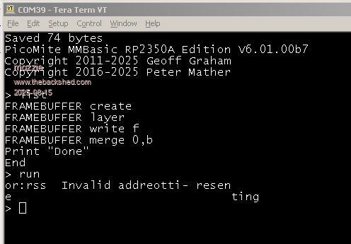G'day Peter, I notice both Kevin (Bleep)and I are not using PSRAM, is it possible the PicoMite is trying to access it when it doesn't exist? All LCD's work correctly on SYSTEM SPI and with most other commands on LCD SPI, seems strange FRAMEBUFFER MERGE looks like the only culprit. Thanks again for your time. Regards, Lyle. |
