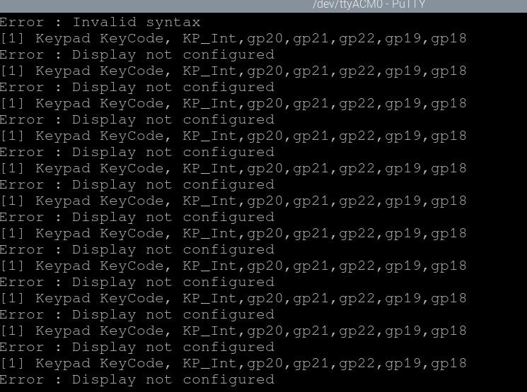 Hello, I think I found a bug... can anyone confirm this? I was trying the Keypad feature, see for yourself: ![]() ![]() ![]() I tried also tried a different syntax, always the same. I am using as you can see a 128x64 LCD... Because of the "display error" in Putty I also tried to do something like: option display 24,80 Problem persists. I have a 2 row by 3 column keypad.. I don't know what I am doing wrong. row1 is: GP20 row2 is: GP21 col1 is: GP22 col2 is: GP19 col3 is: GP18 Greetings Daniel |