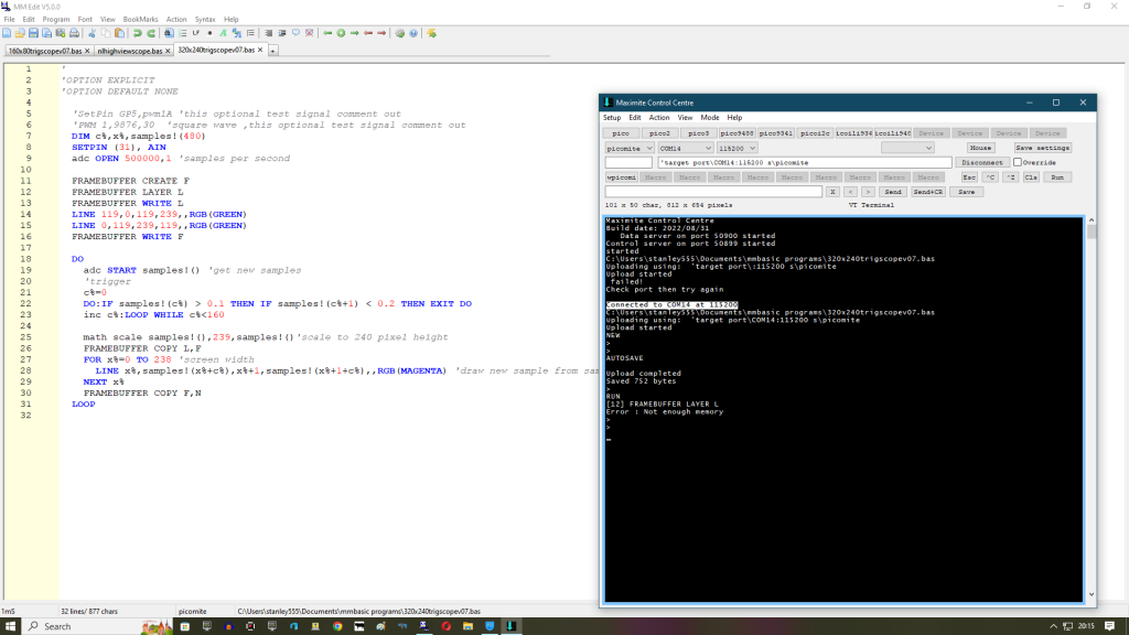 Thankyou @phil99. I've not used peek yet... er...seemed so 80's or picaxe :) I guess my trigger doesn't always find a trigger so the index overflows. First time I used math min and not sure if [index] was pointer to lowest value element. do:If scaledsamples%(c%+1) > scaledsamples%(c%) then if scaledsamples%(c%+2) > scaledsamples%(c%+1) then exit do inc c%:loop while c%<99 |