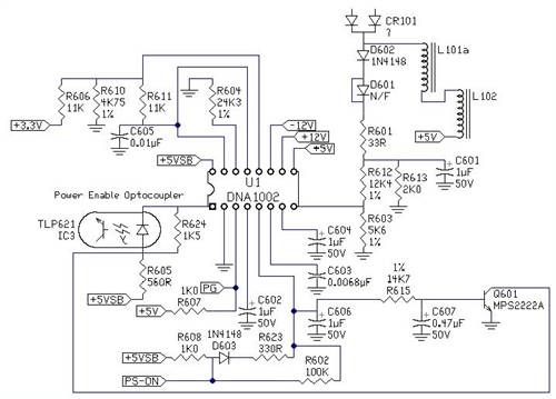 I recall from my last search..... and this does not mean it is gospel..... that the DNA1001 chip is on the high side of the circuitry, and provides both PFC and PWM function (Possibly similar to the ML4819 (with a few less pins) or the NCP1603 if you want to stick to 16 pins. No idea of the 1001 pinouts. A Russian site had the Delta 250w ATX schematic back in 2005/6, but does not seem to be there any more.