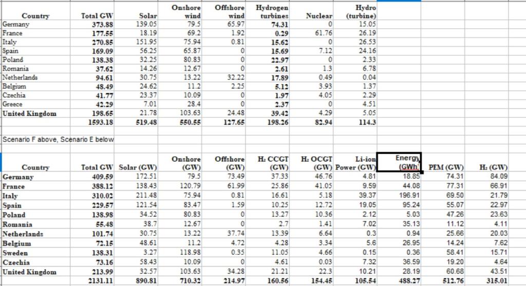 The sources were solar PV, offshore wind, onshore wind, turbine generation from hydrogen, and existing nuclear and hydro. No imports from outside Europe were considered. Batteries were used but not considered a "source" of electricity.