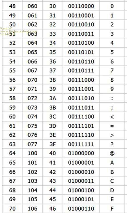Ah Peter, As you are now transferring hex characters and not decimal number strings you have passed 98% of my story. I understand about beginning the hex string with &H to prepare for VAL to do its job. My transcoding suggestion may gain little if you are currently able to convert a complete 32 bits from hex to binary easily / quickly, I did not think that it would handle so large a value. Well done large integers. But Val may cause MMBasic to think a bit? My suggestion of using different characters was an attempt to remove the need for any conversion as the character least nibble could be used immediately. Your hex data - 33 43 30 39 30 31 46 44 Is the character string ----- 3 C 0 9 0 1 F D My proposal is to make it -- 3 < 0 9 0 1 ? = Instead of ----- 0 1 2 3 4 5 6 7 8 9 A B C D E F for transmitting hex I suggest use - 0 1 2 3 4 5 6 7 8 9 : ; < = > ? Look at my ASCII table from earlier post. Now to obtain the correct binary data from the least nibble of the character VAL is not required. To explain further the hex character 44 or C is used to represent the binary 1100, but its least nubble is actually 0011, whereas the least nibble for character < is the correct 1100. I was hoping that thereby the least nibble of each character could be used in turn without conversion. Keith W. |