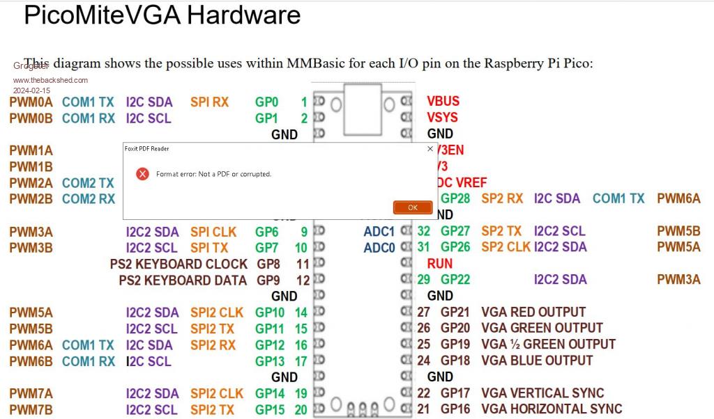 Thanks Peter. In the hopes of learning something can I ask why you chose to use different pins for the VGA than on the PicoMite VGA ? Best wishes, Tom MMBasic for Linux, Game*Mite, CMM2 Welcome Tape, Creaky old text adventures |