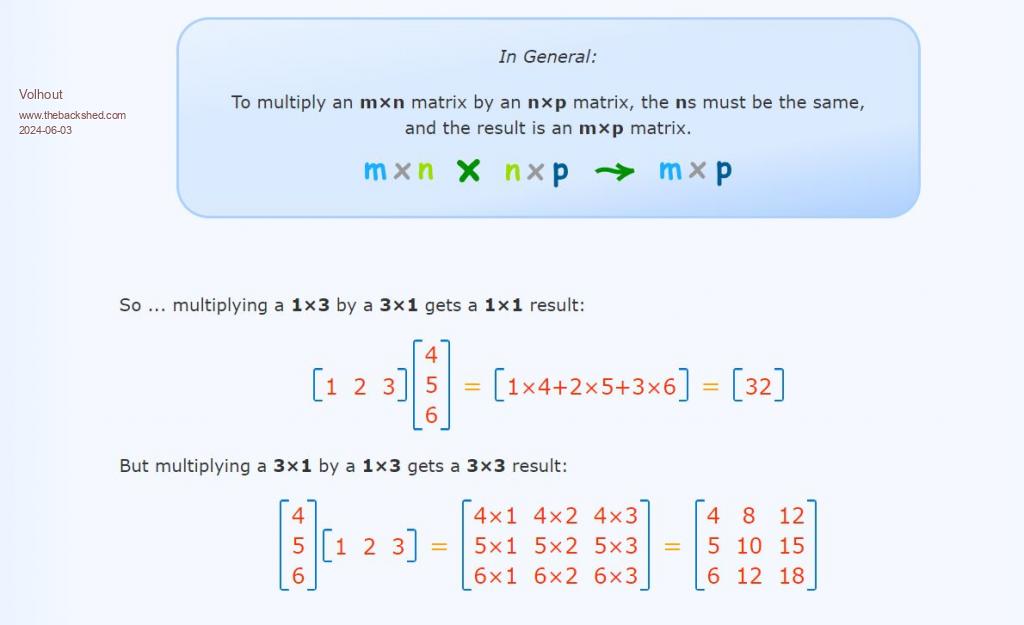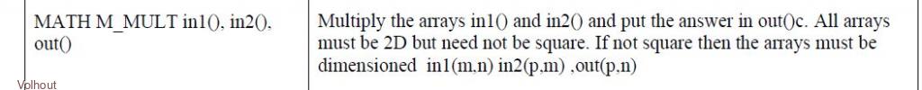 Peter (Geoff), I have a generic question about matrix multiplication. In my Thermal imager project I am trying to speed processing up by doing matrix multiplications to achieve higher video resolutions. But there is something strange in the MATH M_MULT command. This is the knowledge I have: Dim a(1,1)=(0,2,10,100) Dim b(1,2)=(1,0,0,0,1,0) Dim c(1,2) Math m_print a():Print Math m_print b():Print Math m_print c():Print Math m_mult a(),b(),c() Math m_print a():Print Math m_print b():Print Math m_print c():Print When I try the values for n,m,p (see above) that are according to the text book, I get an error message (array dimensions). But when I look in the PicoMite user manual I see this: This implies that matrices in(1) and in(2) are in reverse order in the multiplication ? Please explain how this works ??? Are rows and columns swapped in the MMbasic implementation ? What cells are multiplied by what cells to achieve the geometry specified ? Dim a(1,1)=(0,2,10,100) Dim b(2,1)=(1,0,0,0,1,0) Dim c(2,1) Math m_print a():Print Math m_print b():Print Math m_print c():Print Math m_mult a(),b(),c() Math m_print a():Print Math m_print b():Print Math m_print c():Print Volhout This is consistent in MMB4W and PicoMite, so must be generic. Edited 2024-06-03 17:08 by Volhout PicomiteVGA PETSCII ROBOTS |