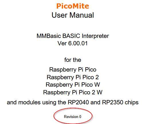 Matthias Hi Matthias, I get the revision 1 from here: https://www.thebackshed.com/forum/uploads/Geoffg/2024-12-10_194930_PicoMite_User_Manual.pdf without any issues. causality ≠ correlation ≠ coincidence |