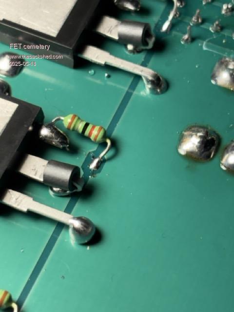 Yep the PWM does seem a bit low but it'll be spending a lot of time over 5kW so will leave it for now and see how it behaves under load. I used a different technique soldering the fets on the second board: ![]() The drains and sources were soldered from the component side using the unregulated 80W iron. The fets were pushed up against the heatsink to keep them cool, and the iron was held on the leads for 8 to 10 seconds, getting both sides of the board hot enough for the solder to melt all the way through: ![]() I'm pretty happy with the result, will do the same to the first board when I swap the gate resistors. No stone unturned, no FET unburned. |