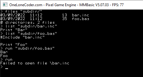 Good morning Peter, here is some more food for thought: 1. Should TIMER be initialised to 0 when MMB4W is launched? that would be a closer simulation of the CMM2. 2. Can I suggest you trim whitespace from the output of the SYSTEM command when you capture it in a LONGSTRING. The output usually ends CRLF which is no use to man nor beast. You might also consider having the option to capture the output in a regular String as that is often both sufficient and more convenient. 3. The CMM2 allows a non-existing SEARCH PATH to be specified whereas MMB4W does not. I think the behaviour of MMB4W is correct, and is what I implemented independently for MMB4L. 4. The format of error messages is different between the CMM2 and MMB4W: On Error Skip 1 Error "foo" Print "MSG: " Mm.ErrMsg$, Mm.ErrNo Error "bar" CMM2 output: > run MSG: Error in line 2: foo 16 Error in line 4: bar <newline> MMB4W output: > run MSG: foo 16 bar For what it's worth MMB4L does what the CMM2 does but without the trailing <newline>. YMMV but in my ideal world an uncaught error would display the line number, but when an error is caught Mm.ErrMsg$ would not include the line number which would instead be available separately from an MM.INFO(ERRLINE). Best wishes, Tom MMBasic for Linux, Game*Mite, CMM2 Welcome Tape, Creaky old text adventures |