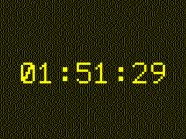 Hi Volhout, Thank you for the tip, I must have missed it. It makes it look much easier. Regards,javavi. Const Mode.N=2 Const Font.N=1 Const T.Scale=4 Const T.Size=Len(Time$) MODE Mode.N Const X.Res=MM.HRES,Y.Res=MM.VRES Font Font.N Const X.FSize=MM.Info(FONTWIDTH) Const Y.FSize=MM.Info(FONTHEIGHT) Const X.Offset=X.FSize*T.Scale*T.Size\2 Const Y.Offset=Y.FSize*T.Scale\2 Dim integer X.Dir=1,Y.Dir=1 Dim integer X.Pos=MM.HRES\2,Y.Pos=MM.VRES\2 Dim integer FC,BC Dim Clr(15)=(0,1,2,3,4,5,6,7,8,9,10,11,12,13,14,15) Colour Map Clr(),Clr() '================================================= FRAMEBUFFER LAYER 0 FRAMEBUFFER WRITE L Font 9 Do If BC=0 Then BC=Int(Rnd*15)+1 Colour Clr(BC) Print @(0,0); For n=1 To (X.Res\8)*(Y.Res\8) Print Chr$(32+Int(Rnd*3)); Next EndIf Sprite scroll X.Dir,Y.Dir Pause 20 FRAMEBUFFER WRITE N If FC=0 Then FC=Int(Rnd*15)+1 Text X.Pos,Y.Pos,Time$,"CM",Font.N,T.Scale,Clr(FC) Inc X.Pos,X.Dir:Inc Y.Pos,Y.Dir If X.Pos-X.Offset<0 Then X.Dir=1:FC=0 If X.Pos+X.Offset>MM.HRES Then X.Dir=-1:FC=0 If Y.Pos-Y.Offset<0 Then Y.Dir=1 If Y.Pos+Y.Offset>MM.VRES Then Y.Dir=-1:BC=0 FRAMEBUFFER WRITE L Loop While Inkey$="" '================================================ DefineFont 9 04200808 80402010 08040201 01020408 10204080 08080808 08080808 End DefineFont |