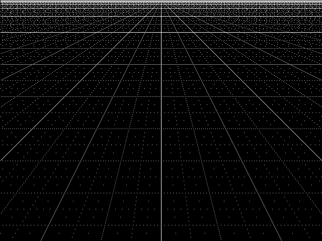 Perspective, Prospettiva, Perspicere ![]() MODE 1 For Y=1 To 480 For X=1 To 640 Z=X-320 If (Z*64)Mod Y=0 Then Pixel X,Y Next Next |
