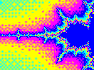 Mandelbrot MODE 2 / MODE 3 ![]() MODE 2 Dim CM(3)=(RGB(Blue),RGB(Cyan),RGB(Yellow),RGB(Magenta)) Dim R(15)=(0,8,2,10,12,4,14,6,3,11,1,9,15,7,13,5) L=Log(2) S=0:For U=-1.725 To -1.225 Step .5/MM.HRES D=0:For V=-0.2 To .0000002 Step .4/MM.VRES Color CM(Int((fM(U,V)+R(S Mod 4+4*(D Mod 4)))/16)Mod 4) Pixel S,D:Pixel S,MM.VRES-D Inc D: Next V Inc S: Next U Do :Loop While Inkey$="" Function fM(U,V) Local X,Y,A,B,C Do Y=2*X*Y+V X=A-B+U A=X*X B=Y*Y Inc C Loop Until C>=50 Or A+B>16 If C=50 Then fM=0 Else fM=5*(C+1-Log((Log(A+B)/2)/L)/L) End Function |
