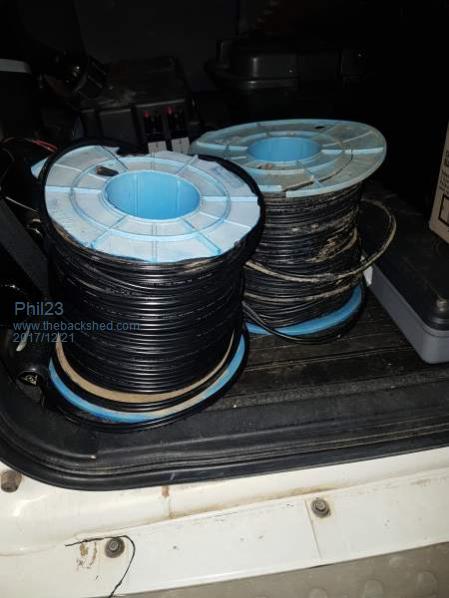 Well just decided yesterday to get anything to start with, so ordered 2 sets of 10m red/black pairs in 40mm; 40m total for $95.00 That & a 30m roll of 4mm twin, for another $80.00 inc post. That was around quarter past 3, so won't see it till post Christmas or new year. 10 minutes later one of the Sparkies I know rings, mentioned I was chasing some cable & he says he might have some old stuff if I slip straight out. 15 minutes out the road, & he's offering me some "scraps". TWO, 100m unused rolls of 6mm twin, designated scrap. Murphy's Law got me for about $175.00, 4:00PM got this in the boot, helping him dispose of trash. Phil. ![]() ![]() |