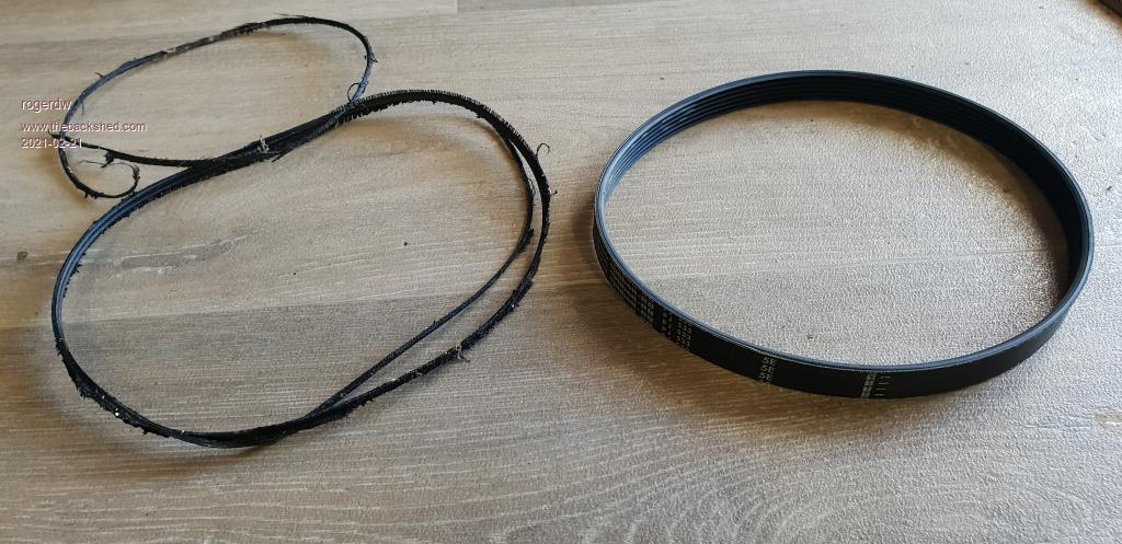 The belt is so worn  ..  the peaks of the pulley ribs are almost cutting through the belt  ...  which is all of 7-8mm wide now that I've cut the damaged half off.