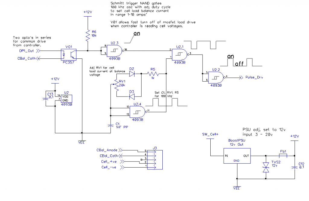 Because the cell voltages are lower than the min required voltage for mosfet drivers, have used a small thumb sized boost module to up the driver voltage to 12v and run off that.