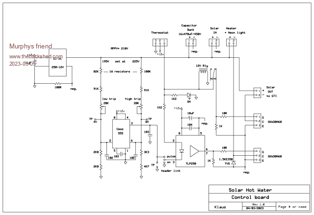The controller was build from information posted here with the addition of the solar power being re directed to a 2KW GTI once the hot water element thermostat turns off.