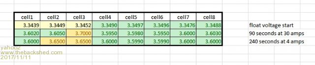 I have had a test 12 volt 4 x Calb 400AH system running a 2.0 KW sinewave inverter powering my fridge and freezer for the past 12 months, whilst I play around with battery management systems, these 4 cells are spares for the main 50v system, not yet commissioned. As they are mostly fully charged by 2pm each day, it makes sense to top balance if needed, I have set solar charger charge cutoff to 3.48v per cell then switch to float 3.38v. There is a coulomb meter in circuit JLD404 to help keep an eye on things. When the charger switches to float, the battery discharges approx 2 AH then stays at that point until the sun goes down, the 3.38 setting for float just maintains capacity, if say both fridges are running, the charger increases current to compensate for the load, then when load has gone, charge currents essentially drop to inverter standby current. Once the cells reach 3.45v it only takes another 2 AH charge to reach 3.5, then approx another 1 AH to get to 3.6, these are 400AH cells so < 1% capacity after the 3.45 point, only reason I have used 3.48v setting is the accuracy of the solar charger. The programmable BMS has upper and lower cell limits and can turn off the inverter if any cell drops to 3.0v or turn off the solar charger if any cell exceeds 3.6v, I have set it to balance at 3.5v, but it rarely ever reaches that as the solar charger has switched to float by then. When initially setting up the cells, I charged each one to 3.50 using a CellLog8 then connected all in parallel and balanced to 3.6v, then placed in series as a 12 volt bank. Mike |