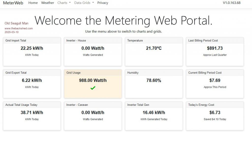 ![]() Havent used the Eastrons but have 4 Hiking modbus 65amp meters doing s good job. One has an external ct clamp, connected to the single phase mains, feed in. It measures total energy input and export from the house. The other three are direct connect type, and measure up to 65 amps these are connected to the outputs of our three solar inverters. these are all connected to a raspberry Pi that monitors, there outputs. As well as the houses energy consumption. Our son wrote all the software, and designed he web porthole, and monitoring. It produces daily, weekly, and monthly reports. Plus uploads to PV Output org. Our next job is to design some form of export control, at the moment when were making to much power e walk down stairs and switch of the dc isolators to one of the inverters. Very scientific, So if anyone has an idea for rs485 controlled switching for 350volts dc at 15 amps, let me know. The basic plan is to temporally disconnect the dc to the inverter producing the lowest output. till export stops. then simple reconnect. The inverters, simply think it been night time. and restart in about 90 seconds. If any one has any thought please feel free to jump in. Andrew AKA Old Seagull Man. Screen Cap ![]() This is just the front Info Page See around the house. All inverters are on the inverters page.But from this we can see export, or import, and control inverters, or turn on or off air-con, etc. Edited 2020-03-10 21:26 by Old Seagull Man |