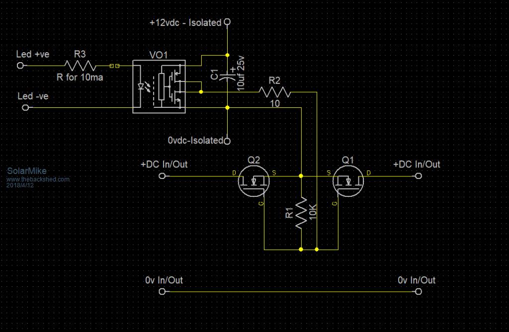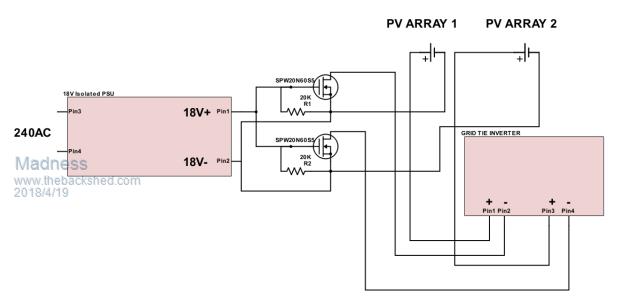 You need these MOSFETs one of these Isolated powers supplies. 2 20K 0.5W resistors silicone insulator pads for the MOSFETS and a heat sink. It is very important that the MOSFETs are electrically isolated from the heatsink and keep in mind you are dealing with high voltage DC. You can get the data sheet for the MOSFETs here so you will know which pin goes where. ![]() Turn on the AC power and it will conduct, turn it off the PV power stops. There are only 10 types of people in the world: those who understand binary, and those who don't. |