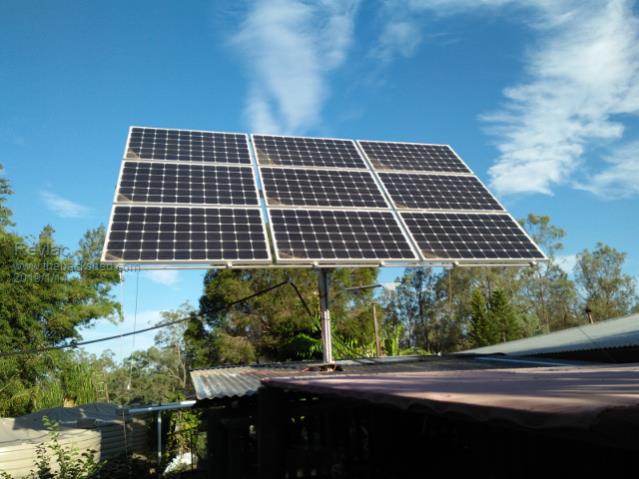 So I had another go today late afternoon, this setup is pole mounted (250W panels) MPPT Charger and has 3 horizontal strings, the idea at the time to make it this way was because the big trees across the road would shade the bottom row late afternoon and progressively shade further up.
