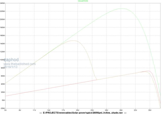 Thank you so much Aaron, I have no sun at the moment or at least not enough to show a shadow so I tried simulating it instead, here is the output of a single panel with first no shading, then one row of 6 then one row of 10 cells the shading factor being *0.25). When the shading diodes are active (10 cells shaded) the output has the classic twin peak mpp's (140 & 70W) that some controllers )including I suspect mine) get confused by (they latch onto the wrong peak).