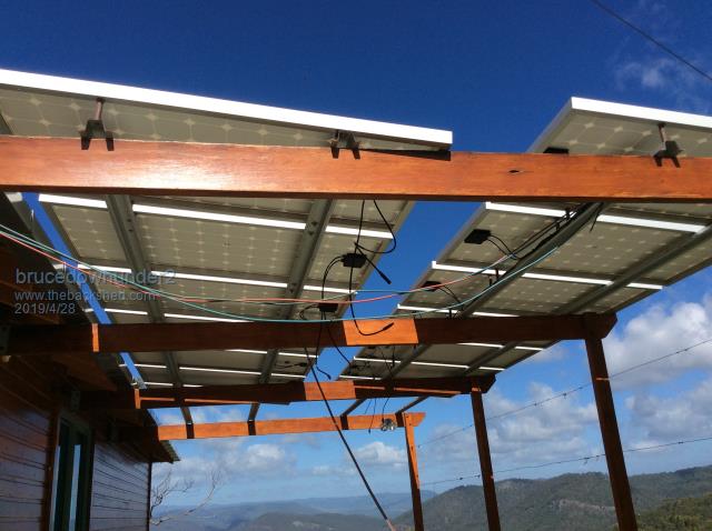 That's looking good Bruce I also left 50mm gaps between the panels, the idea was to let some of the wind get through...dunno, its still there after the storms. I did see some solar panels set up as a cattle shelter (no gaps) I think there was a bore pump near it. Cheers Aaron Off The Grid |