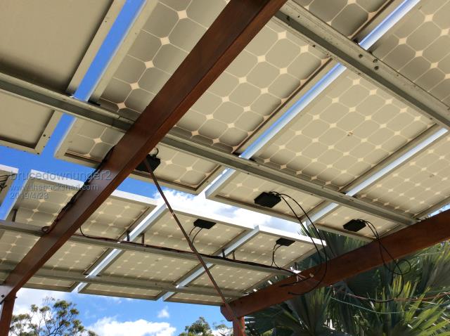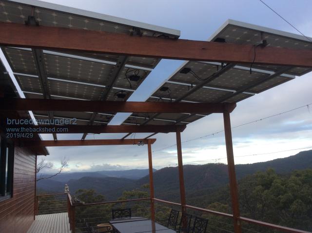 Thanks for the replies. About the gap between the panels or "overlapping " as Ralph asked. We used to have grapevine growing where the panels are now . Only trouble with that was the possums at night and then the python snakes used to make a home in the vines waiting for a meal !!. Apart from the droppings mess from the multitude of different bird life ,it's a good area to have a lunch time BBQ with friends. So, no overlapping ,another reason was the afternoon sun ,being in a low angle ,I had to raise the upside panel to prevent shading =still get a 50 mm or so shading very late in the afternoons I guess that doesn't matter. the 100mm copper water tube used as a riser prevents the accumulation of water plus the shadow sort of goes under ,not over the adjacent panel. This pic is early ,when I started to install them . Bruce Bushboy |