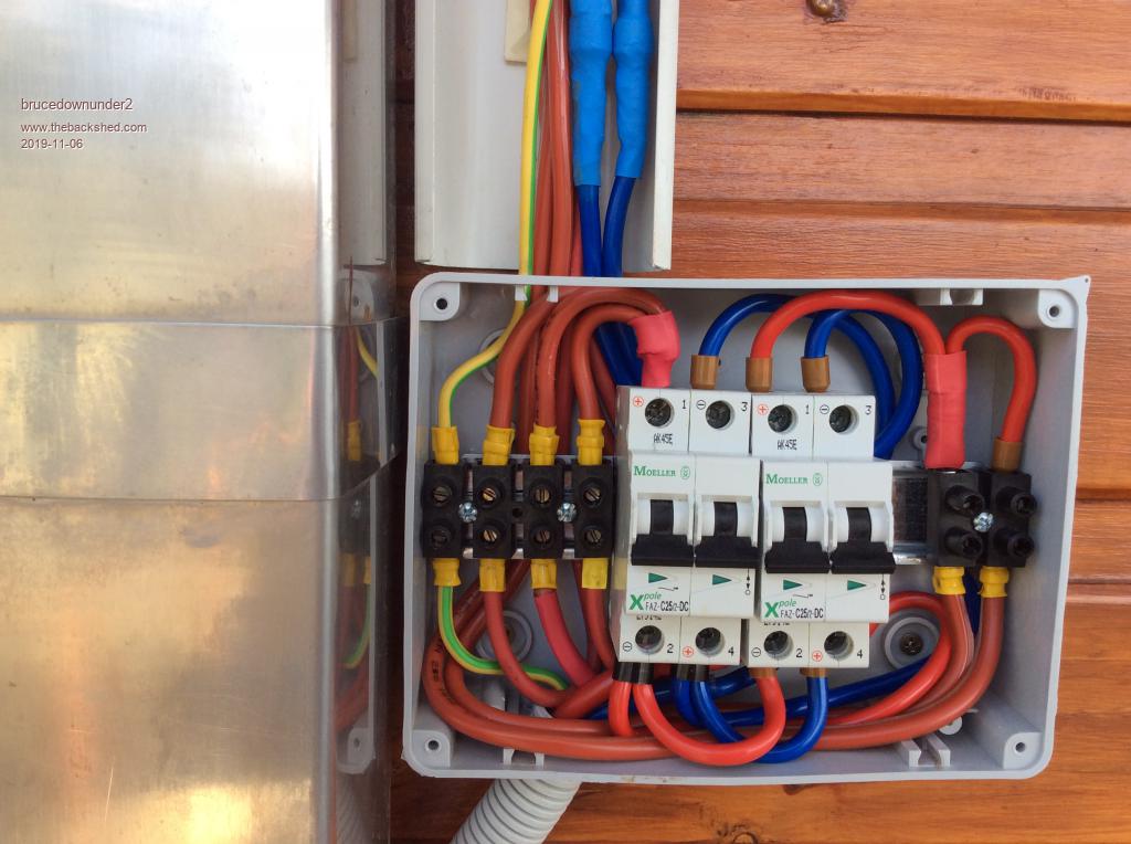 Yes, finally got to finish off the install work and cabling. Installed 6mm tinned single runs from the panels to the junction/disconnect weatherproof box at chest height on the outside wall. Breakers are 25Amp DC polarised (be careful with "in/out" positive and negative). Earthing will be "stand-alone" connected with special anodise displacement washers onto the Al frames. copper earth stake into earth below the deck. 10mm double insulated feed from disconnect box to breaker on regulator panel. Two strings will be combined at the disconnect box to feed the 2.5Kw x48v nom. down to the regulator. Either string can be isolated individually for maintenance, leaving one string "on-line'. Bruce Bushboy |