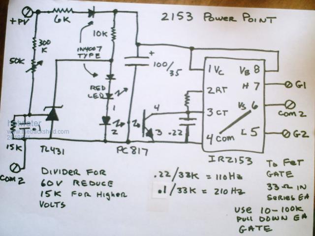 Thank you hotwater for posting the schematic and creating a new thread to start discussion. Thank you Tinker for throwing your hat in the ring. As Dave and I have shared before, understanding the full picture would be very very important to understand these smaller bits However, since I have been following these posts with much interest, I will share my thoughts and welcome all input: Right, so does the modified 72V buck convertor fit on somewhere alongside this system in the more complete schematic? At this point you don't have to provide detailed schematics of each and every block - instead a block diagram that gives us an idea of the overall system will be good enough. Coupled with the RC snubber circuit this is really an ingenious design! 2 Questions (+1 above) instead of the one you requested: 1. Is the capacitor marked "100/35" alongside the PC817 a 100uF/35V rated capacitor? 2. Is the PC817 active high? (if the LED shines, the phototransistor conducts, otherwise floats) So let me try and see if I understand this design: Starting from the left (i/p) and moving to the right (o/p): The resistor divider in series splits the 60V between 2.47V - 2.86V depending on the wiper position and the actual PV voltage (60 * 15)/(365) = 2.4657534246575343 (60 * 15)/(315) = 2.857142857142857 This is Vref of the TL431 set up to shunt/draw away current from the PC817 photodiode when the PV voltage rises ABOVE the setpoint using the wiper. The PC817 photodiode exploits the CT pin of the IR2153 that doubles as an active low shutdown pin (the IR2153 shuts down when CT is brought low). So, when the PV voltage rises ABOVE the setpoint using the wiper, the TL431 shunts current away from the PC817 photodiode, turning the IR2153 on. Conversely, when the PV voltage falls below the setpoint using the wiper, the PC817 photodiode shines, the phototransistor shorts CT to GND, turning the IR2153 off. Now the TL431 works upto 36V, so we have to use a 6k-10k resistor divider to drop the ~60V PV voltage to around that I will post my working of how the resistor divider drops voltage to around 35V in a separate post and hence the rest of the circuit works off that. The 16k resistor also limits the current through the diodes to: 60/16k = 3.75mA Please let me know if this is all absolutely correct. |