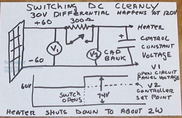 It's not rocket science. I've done it many ways. The best is directly off the PV array voltage. It will take whatever power the charge controller doesn't. The circuits are simple, charge a capacitor bank and pulse the heating element till the voltage drops a little. Then let the capacitors recharge. If you look at it one section at a time it is easier to understand. Only about a half dozen working parts. I think this is the easiest and it can use existing mechanical thermostat (explained later). This is not complete schematic. You have to start somewhere. Asked away, I can't read minds. Please only ask ONLY ONE specific question in a post. It is important that each answer be fully understood before moving on to the next question. This is the KAHN method of learning. If you break the project into parts it is easier to understand. This is a very easy project if approached this way. |