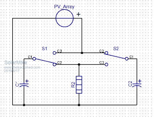 Another way of perhaps better utilizing the capacitor is have two, whilst one is being charged from the PV array, the other is discharged across the HWC element. When the cap voltage falls say 10v below the rated element voltage then the other one discharges... dia here shows concept, replace the switches with mosfets and have your arduino etc monitor the voltage on both cap's, switching the mosfets at the rate necessary to recharge them. Cheers Mike |