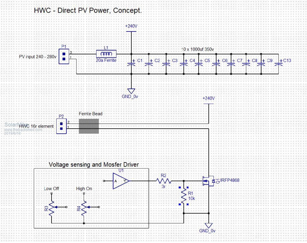 I have looked at all the info I can find on direct water heating with solar. Everything I have seen is eitehr over my head and would take years of learning to build or it just plain does not do what I need. Most things are Low voltage, low wattage that is pretty much tiddly winks for what I want. I have been trying to learn here though but would really like some help and guidance to see if I can cobble something together using pre made boards and Minimal electronic design. I have come up with a no doubt flawed Idea which I think with a bit of help I could manage and satisfy this gnawing feeling I want to be able to do this. the basis for this ignorant idea would be one of these boards: https://www.ebay.com.au/itm/5A-MPPT-Solar-Panel-Controller-Constant-Current-Voltage-Step-down-Power-Module/283456838353? hash=item41ff581ad1:g:HxIAAOSwCyVcuYyt It is capeable of handling 5A @ up to 36V. What I would like to do is hook 8 250W panels to the thing and have a relative output of say around 1.5KW which the panels should be able to provide in good light and get what I can on the ramp up and down. Although well beyond the capeabilities of this board I want to do some minor hackery to use it as the brains to drive other components that can handle the outputs I want just like I use a thermostat on a hot water heater to drive other components capeable of handling the DC currents without Frying itself first time it's powered. I have learned that I can use resistors as a voltage divider so can calculate ( with help) what I would need for the 8 30V panels ( working) to be sensed by the little 6-36V capeable board. I would feed the solar panel output to 6x 1000Uf 350V caps ( If I can manage to desolder them off the old inverter board!) to store the energy and give the 240V, 3600W element a full kick. I would have a mosfet handling the power to the element from the caps Driven by the output from the board which thanks to the resistors, should think it's handling a voltage within it's range. The Mosfet will do all the power switching and I think I'll need a small driver circuit to interface the switching and prevent the power going back and blowing the little board to soot and ash. The little Board should be able to keep the panels on power point giving some efficiency. Is this remotely Viable? I am not trying to charge batterys and divert excess, just something to keep tha panels on power point and producing the best power into the element they can. I don't care if it's overkill with the board or clunkyand could be done with less components from scratch, unless someone has something an idiot like me can build and understand or would be open to a paid job of building such a board, the requirement is -I- can build it and it does what I want. I have done a few things like this by cobbing different boards together just through wiring them and I'd like to be able to do the same with this far as possible. If it's not viable due to my extreme electronic Ignorance, fair enough, if it is possible, I'd greatly appreciate some help with the sub circuits. I am thinking I'll have to go with a DIY mosfet circuit as an SSR may not be able to be switched fast enough but If it could be with the help of a bleed resistor, so much better. The more prebuilt and just wired together I can make it, the better. If it costs $50 in boards that the knowledgeable could build for $5, so be it. the goal is ease of build and function not good circuit design and absolute low cost. :0) I think this is something a lot of people would be interested in IF there were something simple enough they could build without having to decipher pieces of a jigsaw breadcrumbed by others that will take years to understand. I'm surprised the Chinese haven't produced a board for this purpose, maybe they will in the future? I wonder what I would cost to commission one and have them made to sell? Anyway, any and all input on my idea of ignorant simplicity would be appreciated. |