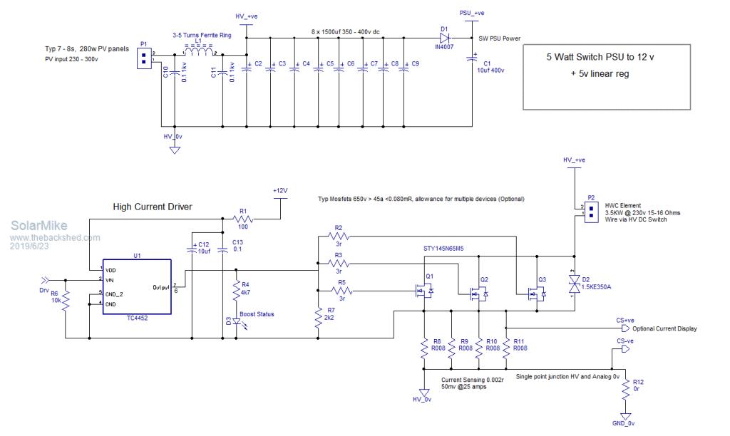 Currently renovating a house, have just replaced all the old plastic plumbing pipe work and installing a new 300 litre solar ready stainless steel HWC. The HWC has dual 3KW elements, so will power the upper from mains 230vac with a timer and the bottom one from this circuit and an array of 10 x 300w PV panels.