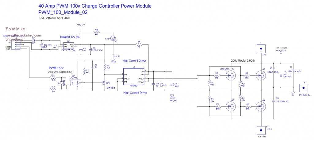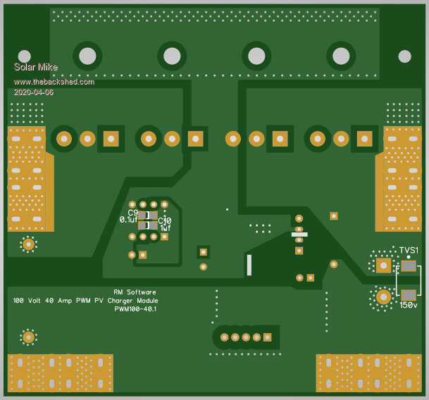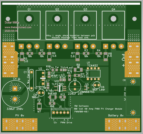 My PV setup at home is going to be completely rebuilt as I'm moving over to a 100v Lifepo4 battery bank. All the panels on the roof are coming off and 24v 275w items fitted. The inverter will be changed to run from 100v and new charge controllers designed. Quick solution for PV controllers is go to PWM, will design a mppt solution later in the year. I have 28 x 24v panels, if they are arranged in multiple series strings of 4 the voltage of each is Vmp x 4 = 31.2 x 4 = 124.8 volts, Voc will be 38.1 x 4 = 152.4 volts unloaded. The lowest battery bank cell voltages I have seen are 3.2 as they never get fully discharged to their 3.0 level; this gives a voltage range of 3.2 to 3.5 volts per cell, x 32 cells = 102.4 to 112 volts. As the mppt voltage of the series strings = 124.8 volts, this is a good match and good enough until the mppt pv controller is developed. Rather than build a big arse 150 amp controller, I would prefer to make a modular design architecture similar to the previous mppt muli-phase system. So have created a small pcb module 100 x 93mm with 4 mosfets as the pwm switch, using 1oz copper this will easily accommodate 40 amps with approx 12 watts loss. The switch modules have pcb high current right angle connectors so can stack on top of each other to expand the system to suit the amount of PV strings paralleled together. A host pcb to accommodate the stack-able modules will be designed with a cpu and voltage\current sensing etc. Here is the module circuit and layouts: More to come... Cheers Mike in lock down. Edited 2020-04-06 17:43 by Solar Mike |
