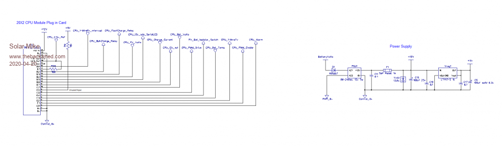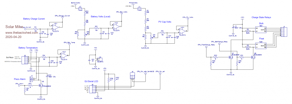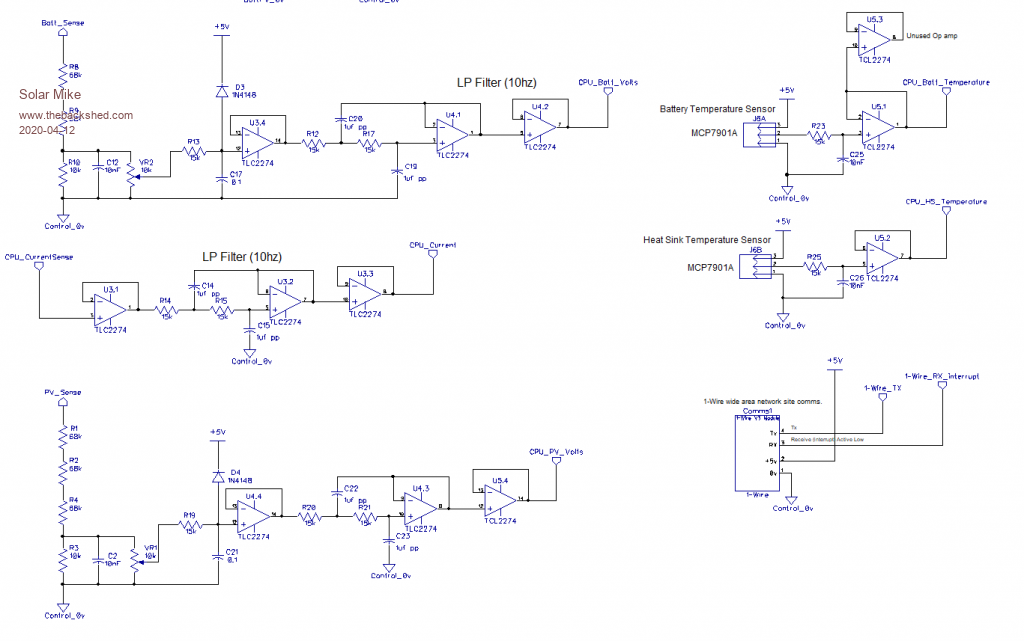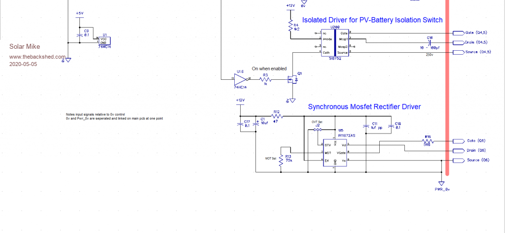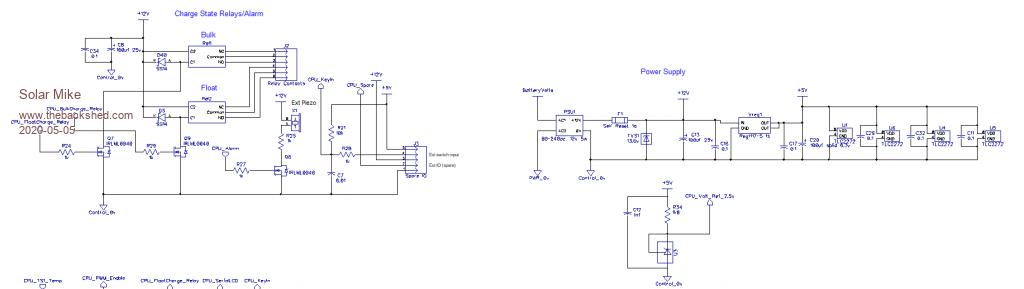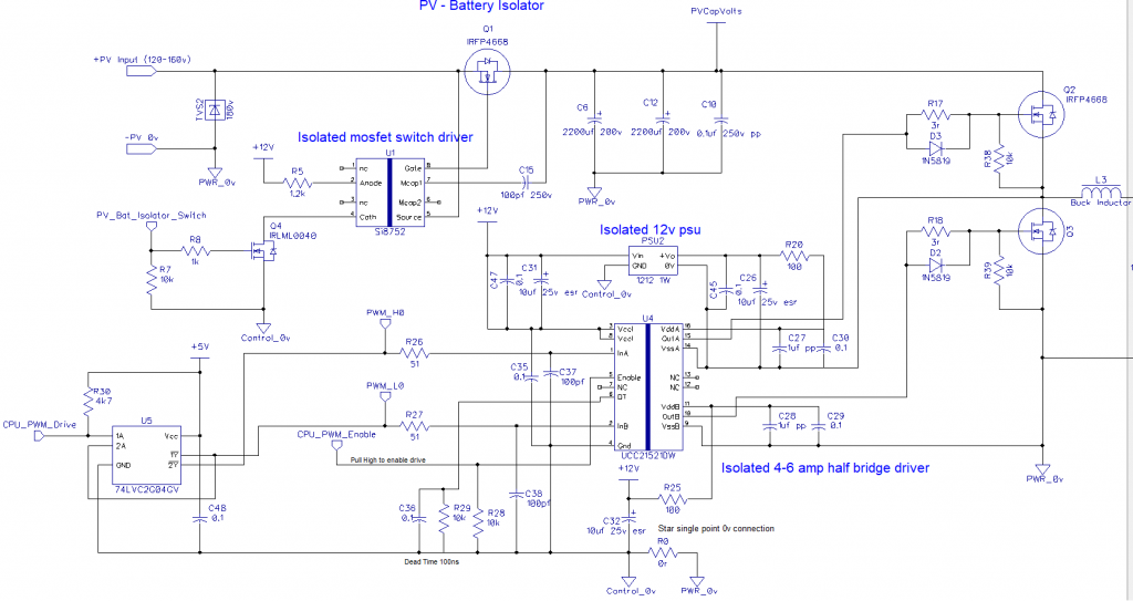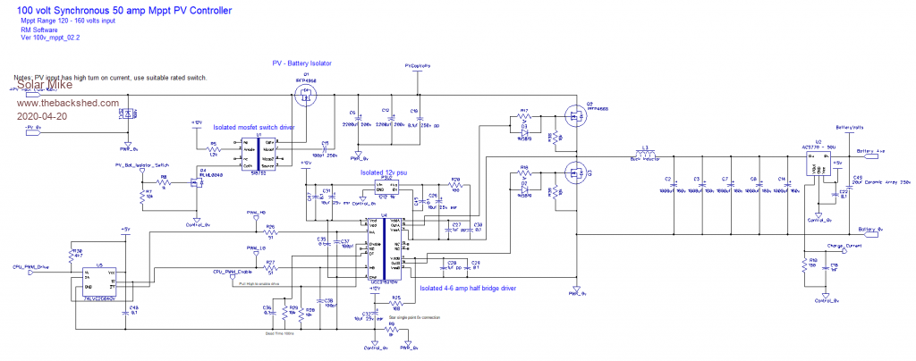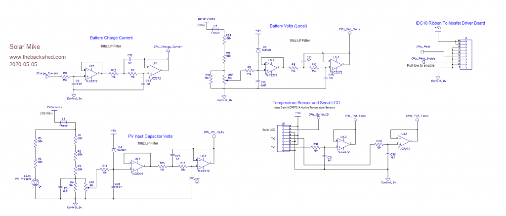 Hello Mike, Very intersting project.I need some help for you.I want to build a controller for a battery bank 360v.I want to use some hoverboard batterys and do the charge directly from PV and the inverter connected directly to battery bank.My entire house at night i have a consupting no more then 300watts and at the day maximum 2000watts.Tell me please if your schematic can be modified to obtain at the ouput 420v with minor modifications of mosfet voltages and the inductor calculations. Can you share the cpu part with software used in this application? I really appreciate your effort.Thanks very much |