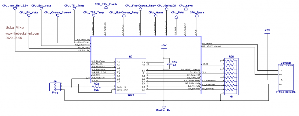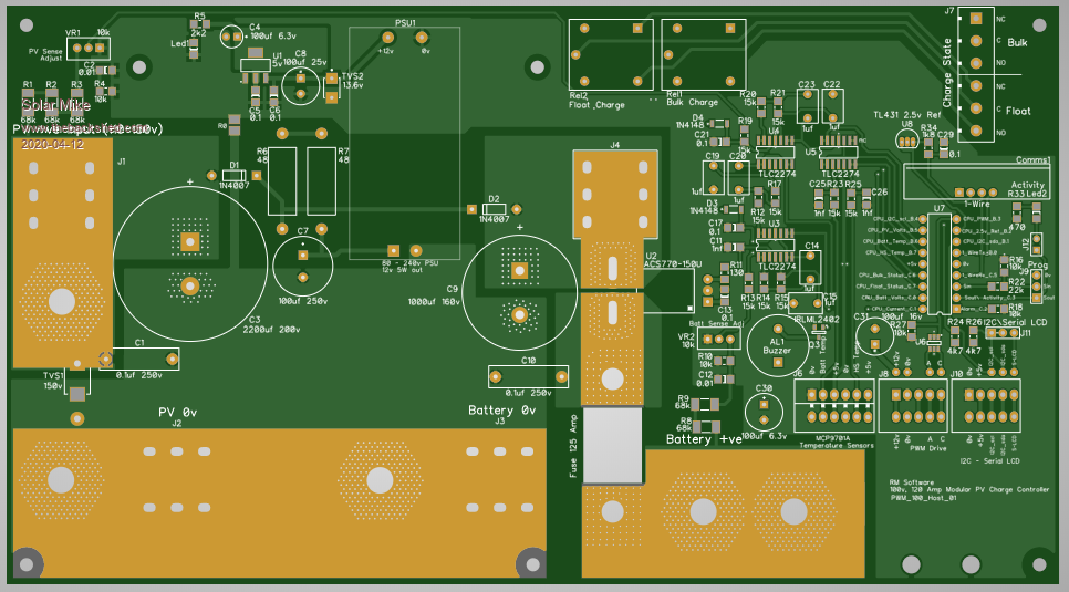 Have made a start on the host controller mother board that can have 1 to 4 PWM power modules fitted; it is a similar layout to the previous design multi-phase mppt controller, except everything is single phase, the only time we have PWM control is when battery voltages need limiting at full charge or on float etc. I will be setting up the PV array at home as 3 groups of 2 x 4 series panels in parallel (approx 120v @ 17 amps) per 4mm^2 paired cable run; so will probably use 2 power modules fitted to the host controller. The advantage I see here is that adding more PV is easily done by increasing the module count; if a module blows up it will be a simple matter to swap it out. This design based on a single Picaxe 18M2+ cpu, as I found a box of them in my junk pile, thus the limited IO input count in the design, IO for temperature sensors, sensing for PV and Battery voltage, Charge Current, I2C or Serial LCD display. I haven't allowed for a keypad to enter various voltage settings, decided those set points can be entered via the code parameters. Here are the power module connections, the 5 watt 80-240 vac to 12v psu is powered from either the PV or battery. PV, Battery voltage sensing, temperature and custom 1-wire network, have used active low pass filtering to get rid of crud on the sense wires. Showing charge state relay outputs, piezo alarm, LCD display, cpu voltage ref and push pull PWM driver, CPU pin connections. PCB top (131 x 238mm): Vertical copper bus-bars bolt to the 4 large 120 amp 6 pin pcb connectors, these host the stacked power modules. PV and battery cables bolt directly to the tinned pcb areas by 6mm bolts. PCB bottom: Cheers Mike |