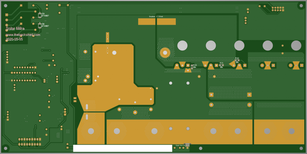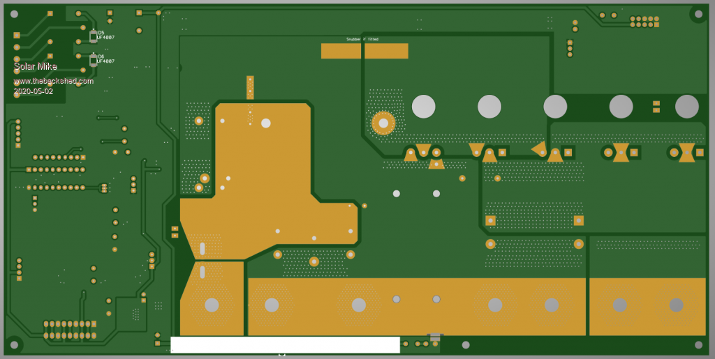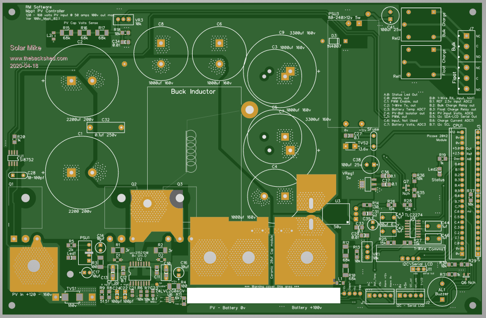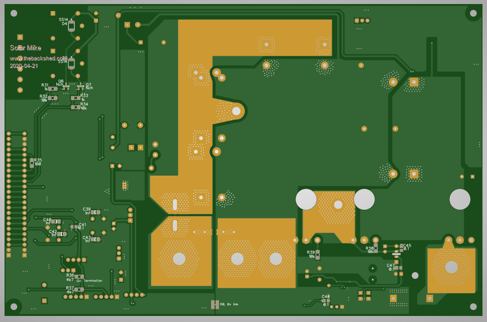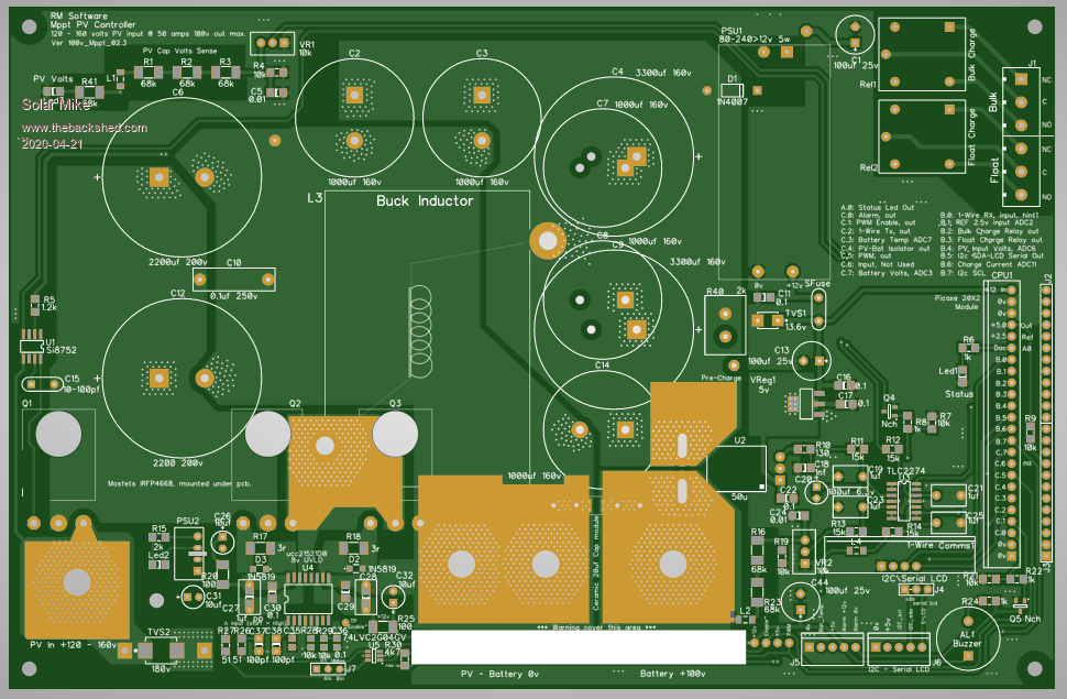 Too much time in lock-down... Have yet to send the above gerbers off, as the only way to get them delivered now is by courier, DHL, which costs more than the boards. So have also designed over the past few days an mppt synchronous board suitable for 100v battery banks. Will get this design finalized and ordered in the one delivery. PCB is similar size to the PWM controller 230 x 150mm, have used a faster cpu, picaxe 20X2, so I can run 64 Khz pwm on the mppt control side. This simple design only has 3 mosfets that bolt under the pcb, so is limited to 50 amps max, mostly it will be used around 30 amps odd (3KW input). Have allowed for different caps, depending on what I have to test it. Powdered iron core for the inductor just fits on the pcb. I intend to bolt the cables direct to the pcb with 6mm bolts rather than use big solder connectors. All gnd tracks use star layout to keep noise down with active filters prior to the cpu inputs. Will draw up a cct in the next day or so, to check any pcb errors. More to follow.... Cheers Mike Edited 2020-04-18 22:26 by Solar Mike |