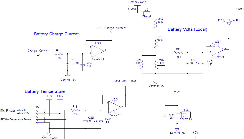 Here are some notes on the design. PV input and buck switch stage: Some sort of isolation switch (Q1) is required to prevent the battery discharging into the PV array at night, in some designs I have used a high power relay as this gives very good protection from possible nearby lightning surges. Here to keep it simple a 200 volt mosfet is used with an on resistance of 0.008r, so little power is lost at 30 amps or so input. The Si8752 isolated mosfet driver has been used to drive the mosfet, the device generates >10v gate drive to turn it on fully, its not fast, 100's of uSec turn on, but good for this application. The buck and synchronous switch devices (Q2, Q3) are driven from a UCC21521DW isolated driver, 4A/6A current. This device has 2 inputs along with an inhibit, it has a resistor set dead-time adjustment and guarantees there will be no shoot through for any combination of input logic, which is standard 5v compatible, I have used a dual inverting buffer gate to provide the 2 inputs from the single PWM CPU signal. A small 1 watt 12-12v isolated psu provides the power for Q2's voltage drive. PWM frequency will be 64 Khz to keep the buck inductor size down. CPU Analog Inputs: These switching circuits generate heaps of EMI, it gets everywhere and easily coupled from nearby wiring by capacitive mutual coupling. To help alleviate this I have used a ferrite bead on some inputs with a simple RC filter followed by a high input impedance op-amp to present a very low input impedance to the CPU input. Example Battery Volts Sense: Note: Think some mechanism is required to initially pre-charge the main caps; I hate to think what sort of current spike will occur when the 100v battery is connected to the output with fully discharged caps of approx 0.01 ohms... Cheers Mike Edited 2020-04-21 10:40 by Solar Mike |