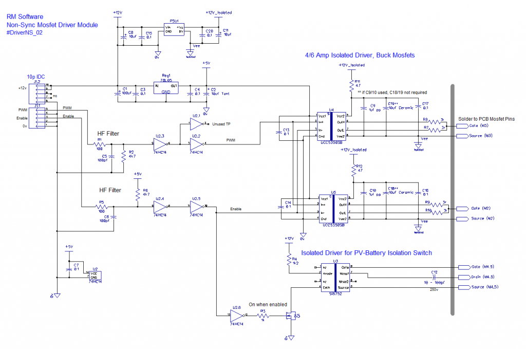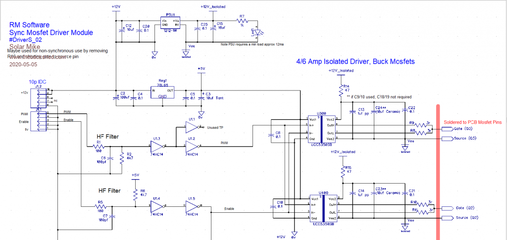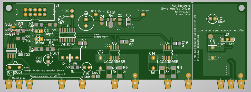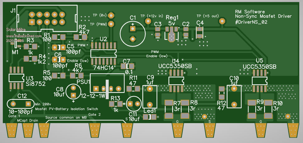 Email from DHL Express, seems delivery will take 3-4 weeks, normally 3-4 days, coming by boat ??? Made a start on board mods to accommodate the non-synchronous dual rectifier, not really happy with the layout of this design, it could be much better if the mosfet control and drive electronics were moved from the main pcb carrying the high currents to a daughter board that is soldered on top of the mosfet pins. The design could also be made more efficient if dual mosfets were used in both the PV-Battery isolation switch and the buck inverter, a single 80 amp rated rectifier will be fine as is. If the design is used at lower voltages say 48v, then the currents are higher and better shared by dual devices. Here is the layout for the driver board, it measures 41mm high by 100mm long and sits on top of the 4 mosfet pcb pads; the mosfets are bolted 28mm apart. I have used the UCC5350SB isolated 4/6 amp drivers, one for each mosfet in the buck switch. The slower PV-battery isolator is driven from the isolated voltage generator Si8752 chip. Input socket J1 has +12v, 0v, PWM drive and Enable signals. Circuit is in my head, will draw it up to check layout. Cheers Mike |