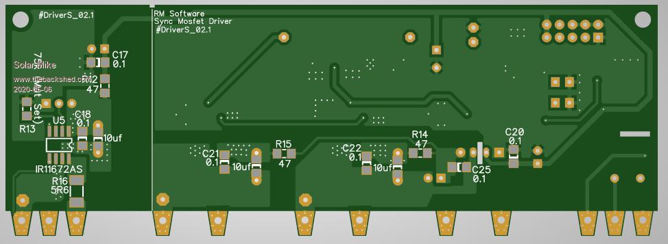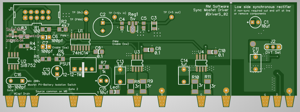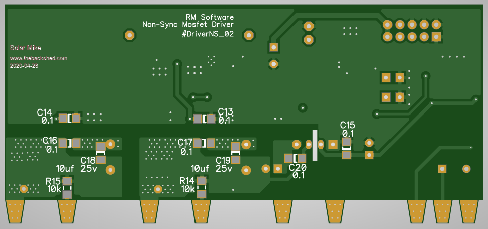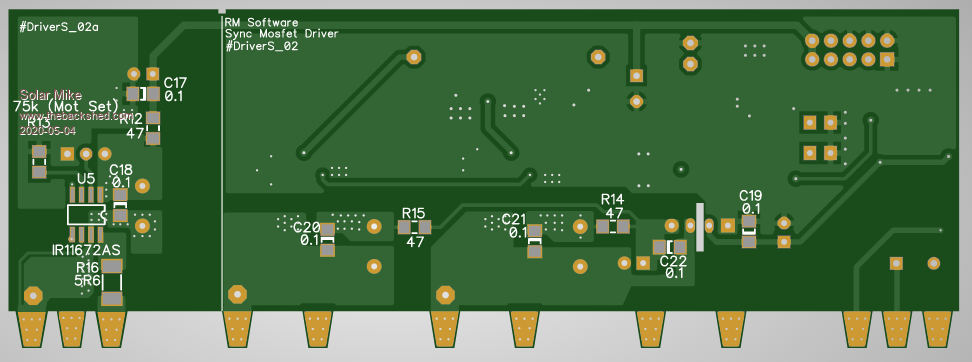Found another issue on the driver board, power track missing, new files attached. Also I have a cunning plan, and placed extra pads in the mosfet connection points. Gerbers_Sync_02_1.zip Off to the pcb manufacture they go. Cheers Mike |
