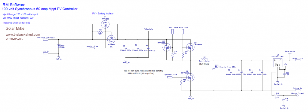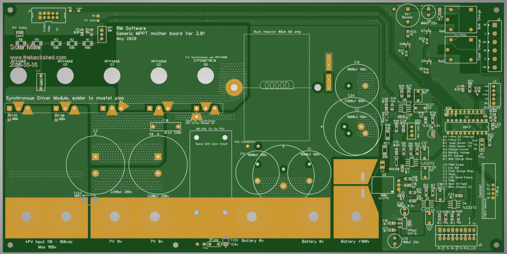 Schematic for the generic Mppt PV charge controller, can be either fully synchronous or not, depending on components. The driver pcb solders direct to the mosfet pcb pads for optimal layout. I will be testing it on a nominal 100v Lifepo4 bank (100v @400 AH), PV voltage range approx 126 - 156 volts, with max charge of approx 60 amps, this will be the limit for the 1oz copper pcb and the buck inductor. Found 1 error on the pcb, will fix it and post a new layout.. Cheers Mike |