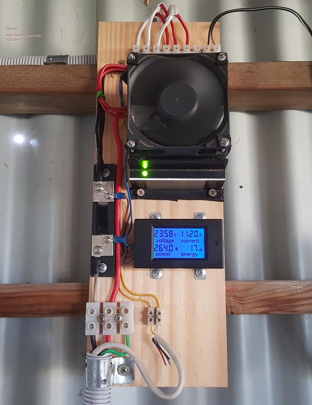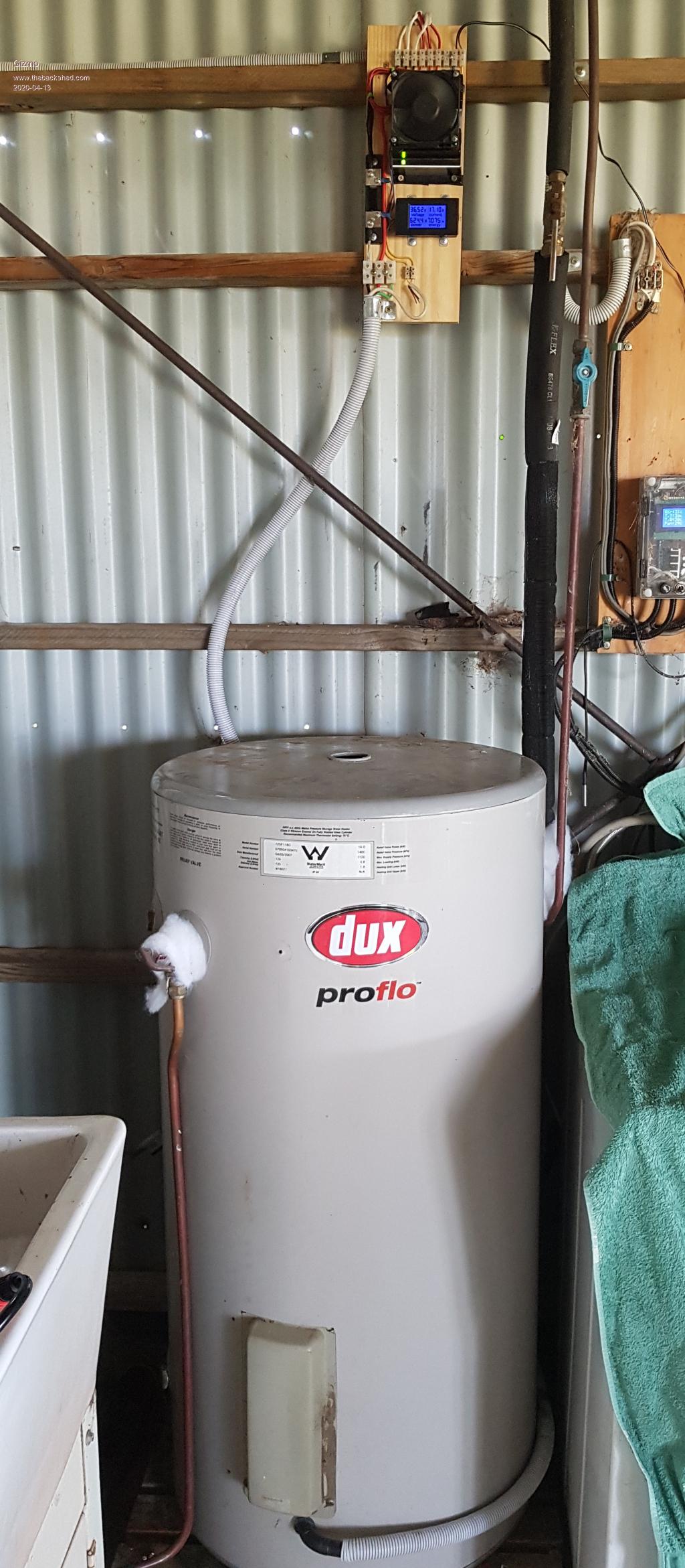 Hi I've been running a thrown together hot water system for a few years. It used a 330 litre tank, a couple water heating solar panels, a pump and controller. It worked ok, but for a couple of months in winter it struggled to even warm the water, and I had to cover the panels each night to stop them freezing as it often goes below zero here. Fortunately I have a on demand gas hot water heater I can switch in when the solar water heater isn't up to the job. After some interest on the forum regarding heating water electrically, I decided to go down that path. Second hand solar panels are very abundant and cheap here in Australia, a side effect of people upgrading their grid connected solar plans. I bought 7 230watt 60 cell panels for $55 each from a guy on Facebook, and a 1000watt 48 volt heater element for about $84 delivered from https://ringhotwater.com.au/. ![]() The existing 330litre tank was getting rusty, so swapped it for a near new 120litre tank I picked up at a clearing sale for $20. Mounted 6 of the solar panels in a series parallel setup, plumbed in the tank with the new element fitted and wired it up. I used a 100 amp relay, driven by 12 volts from a plug pack on a timer. This 12v was switched by the water tanks existing thermostat. All worked fine the first day, the tank was heater up to 70c from cold in about 6 hours. Next day, it wouldnt work. The relay had gone open circuit, on closer inspection, the contacts had vaporised. ![]() This was due to the DC arc when the contacts were opened. So I tried new relay with capacitor resistor supression across the contacts. Same deal, zap. Dug up a power mosfet from a junked inverter welder, mounted it on a heat sink with a fan, added a few components and bingo, no more zap. ![]() To keep an eye on things I wired in a amp/volt/watt meter. ![]() So far so good. Be interesting to see how it goes in mid winter, at least I wont need to cover the panels at night anymore. ![]() ![]() Glenn The best time to plant a tree was twenty years ago, the second best time is right now. JAQ |