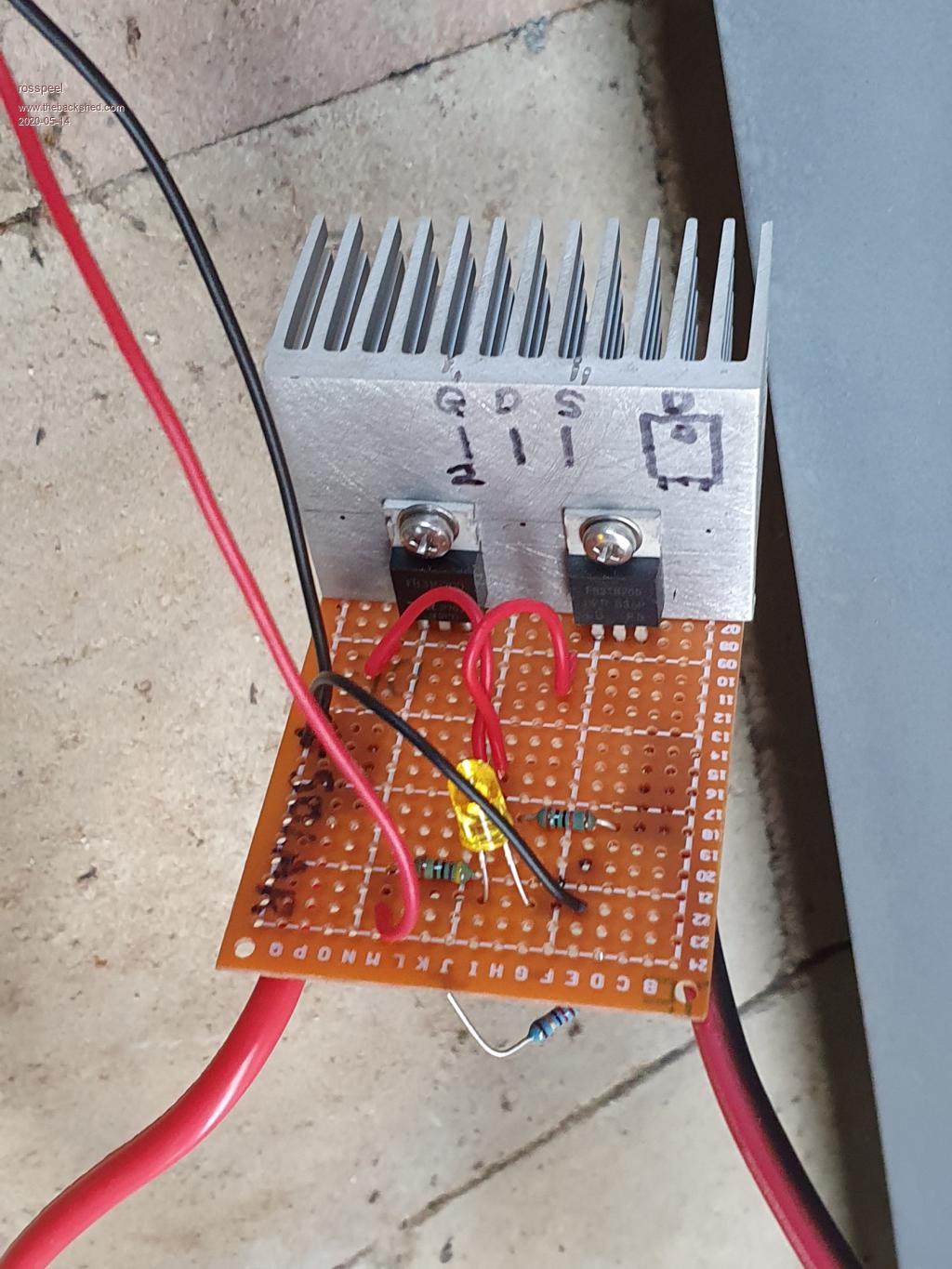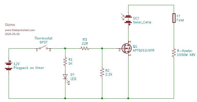 Here's the circuit, from memory. The mosfet is something I found in a dead inverter welder. Its probably expensive, so look for something cheaper, 40 amps 100 volts N channel mosfet. I'm using a 12v plug pack on a timer as the 12 supply. Once day I'll use a little 12v solar panel instead. Glenn Edited 2020-05-05 11:53 by Gizmo The best time to plant a tree was twenty years ago, the second best time is right now. JAQ |