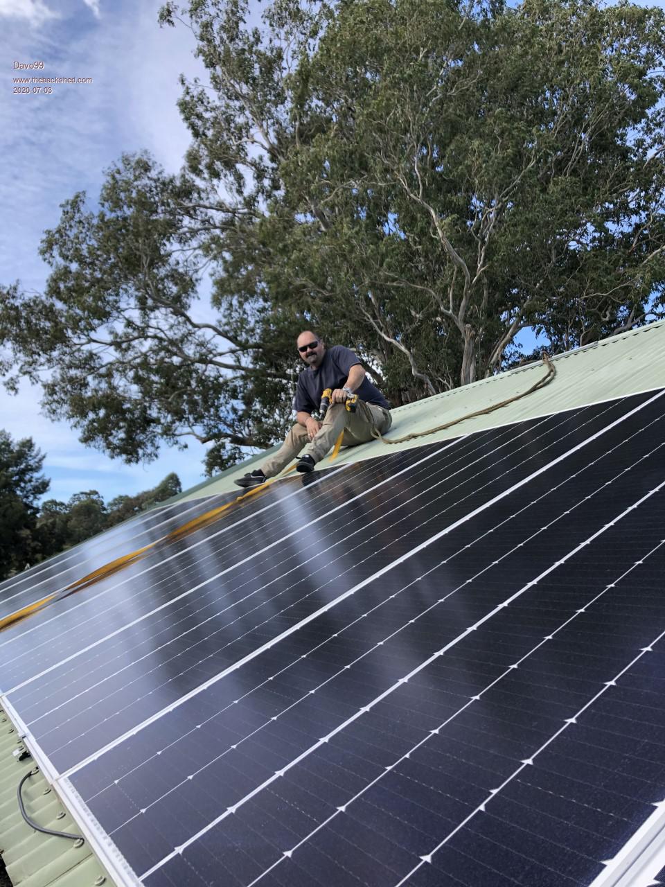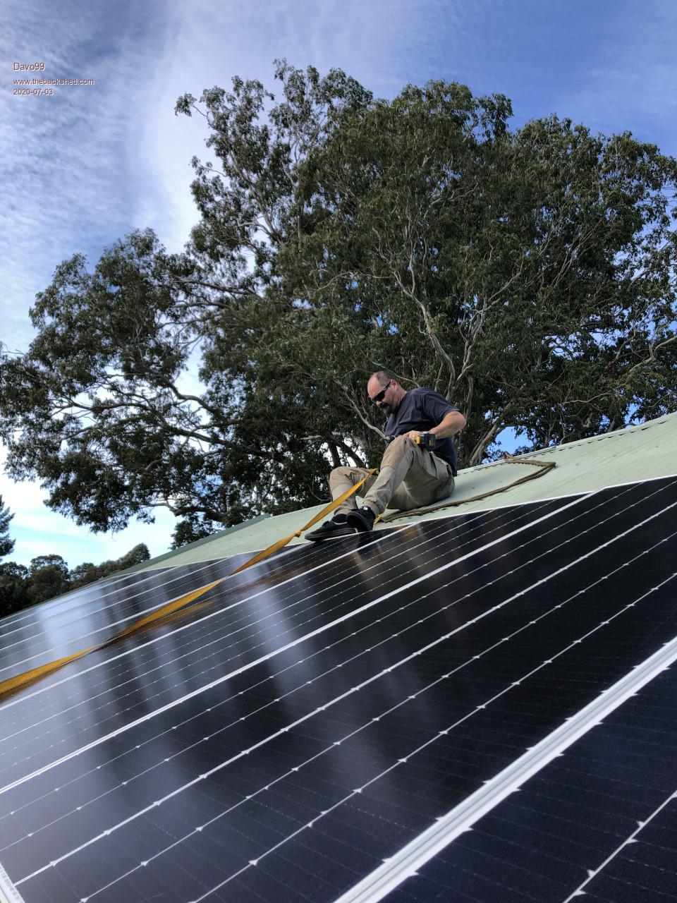 Crash test Dummy overcoming fear of heights and installing panels.  Note full safety equipment, PPE and observation of all OH&S procedures and practices.  May be a bit hard to see in the pic but they are all there in place and was approved by a safety inspector before and during the time the work was carried out.