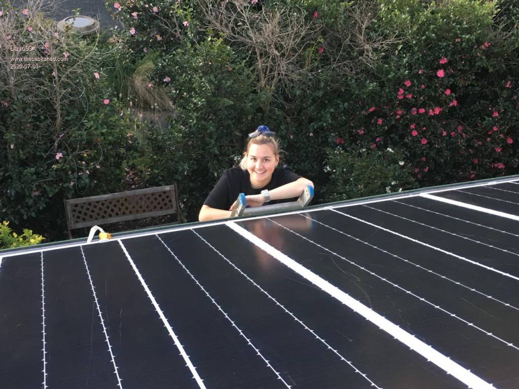 From there, my daughter lent a panel against the ladder and put the hook from a tie down strap under the top edge. I had the other end and hauled it up while she mainly Guided it and helped it over the top of the ladder. I used the first panel as the foot hold and then got the next panel up far enough to move it across to the next clamp I had measured and preset while I connected the cables and then moved it into position. My Daughter then tightened down the clamp and we rinsed and repeated along the roof for 8 panels. I put a good dob of silicone roof sealant under each clamp to make sure the screws were sealed as the original seals being 20 years old are pretty weathered and I wasn't sure of their durability when disturbed or if they would work with the clamps.