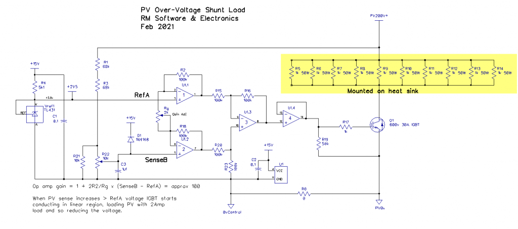 During testing of these controller designs on a common set of panels, these series strings can reach quite high voltages when unloaded, for instance I want to put up a 5s array where each panels unloaded voltage is 40v, but the mppt voltage is a lot lower 31.5V; this gives a working point of 155V which is ok, the controller can handle that. However during float or first connection the PV input voltage is around 200V, dangerously close to the input capacitor max ratings and the mosfets max voltage. Rather than use higher voltage caps and higher spec'd mosfets (with higher on R) thought it may be simpler to place a device across the PV input that allowed a load be placed across the array when the voltage increased beyond a set value. A voltage sensitive shunt load springs to mind, using an IGBT device running in linear mode, so the higher the voltage above a set point, the more it turns on, thus lowering the voltage. Couldn't find anything suitable on the net, so here's the result of a thought experiment. IGBT devices are quite robust, their SOA curves have good operational area down to DC and they are cheap. The old style LM324 op amp can run single supply at quite high voltages, certainly high enough to drive the IGBT in its linear region. The PV voltage is compared to a 2.495 reference by a subtractor circuit, the difference multiplied by the gain of approx 100 is the linear drive. I could use a bunch of 50W resistors or something like an old single bar heater as the load. Has anyone ever built something like this... Cheers Mike |